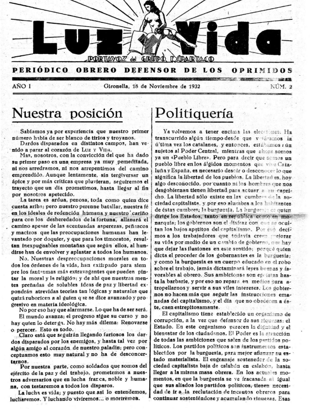 Periòdic obrer portaveu del grup anarquista de tendència trentista de Gironella anomenat “Espartaco”. La publicació va sortir durant els anys 1932-33 i en aquesta edició hi manquen els números 16 i 26 dels 28 que presumiblement va tenir aquesta revista.